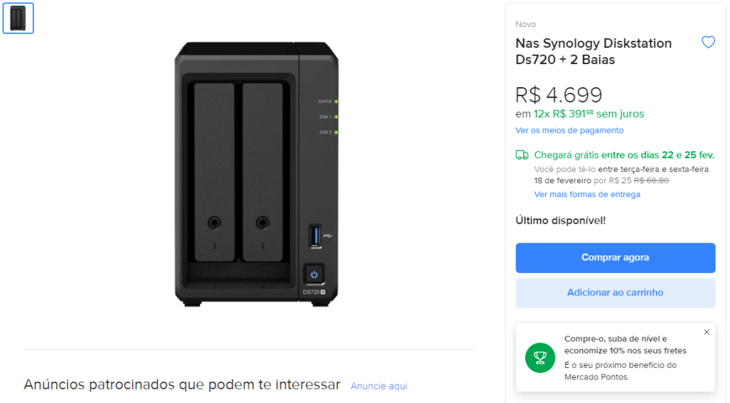 Para poder substituir vários serviços, precisaremos de um NAS que possa rodar “Docker” e assim, utilizar as imagens pré-fabricadas e instalar esses pacotes de serviços no nosso dispositivo. Primeiramente precisamos selecionar o equipamento certo – eu tenho experiência com os equipamentos fornecidos pela Synology (não tenho nenhum filiação e isso não é um anúncio) portanto sei qual deles nos atenderia e olhando no MercadoLivre podemos obter o seguinte modelo: