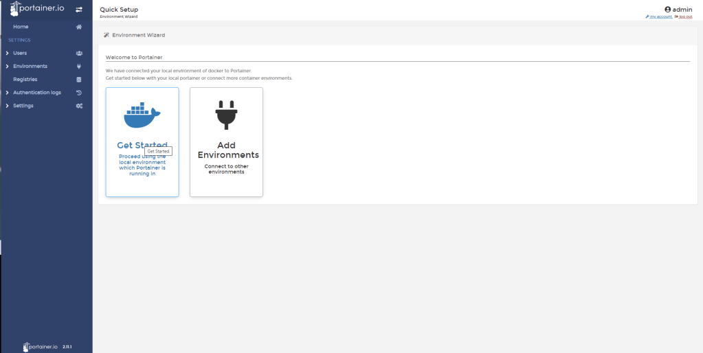 Clique em “Get Started”. Isso vai selecionar o ambiente local.