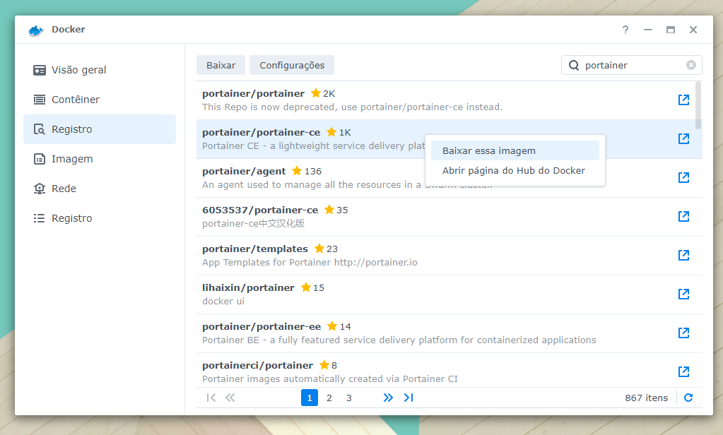 Abra o Docker e clique em “Registro”. Procure por “portainer”, selecione a imagem “portainer/portainer-ce” e clique para baixá-la.