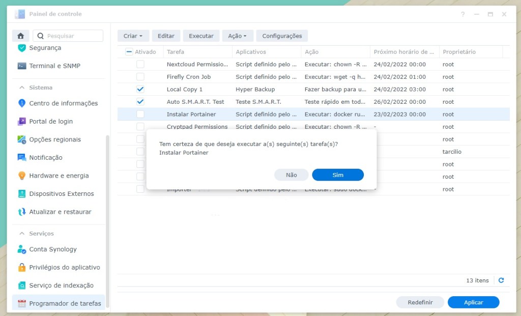 -v /var/run/docker.sock:/var/run/docker.sock. Ele torna impossível fazer instalações pelo GUI. - Eu acho melhor baixar a imagem através do GUI da Synology ANTES de executar o comando através do script. Por um motivo ou outro, algumas imagens não eram baixadas quando eu usava somente o script, portanto, passei a sempre baixar a imagem antes. Acho que isso tornava a instalação mais rápida pois não precisava esperar o Docker baixar a imagem e também podemos observar o progresso de download da imagem.