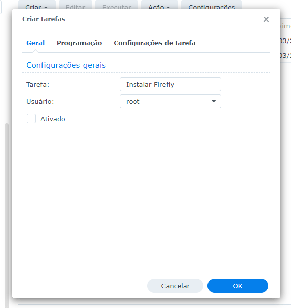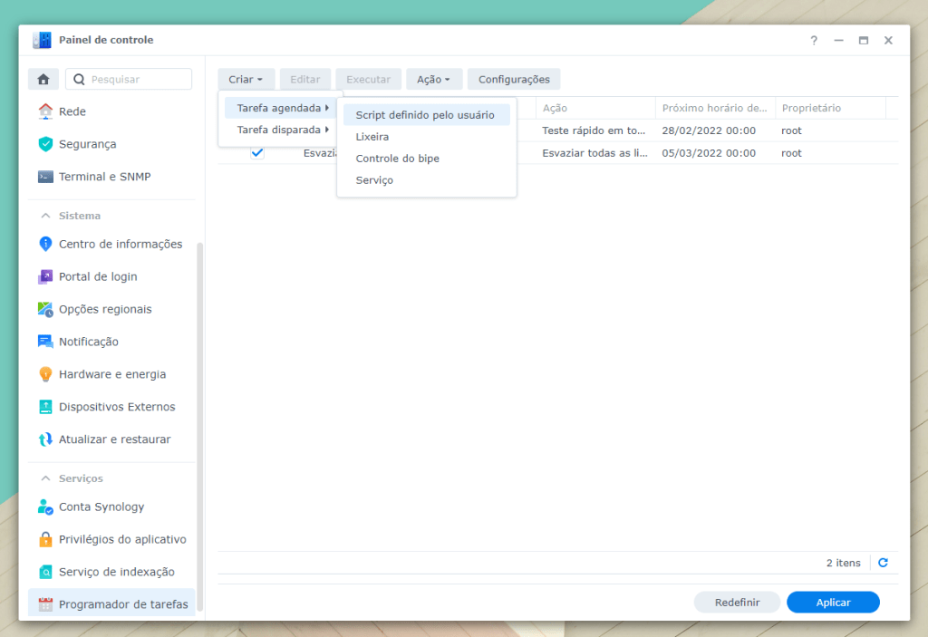Em seguida selecione para “Criar > Tarefa agendada > Script definido pelo usuário”, siga os passos das imagens abaixo e insira o script de instalação (com seus valores reais).