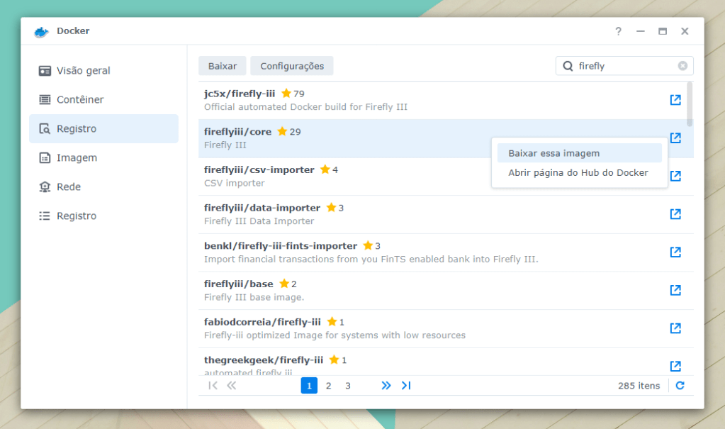 Abra o Docker e clique em “Registro”. Procure por “firefly”, selecione a imagem “fireflyiii/core” e clique para baixá-la.