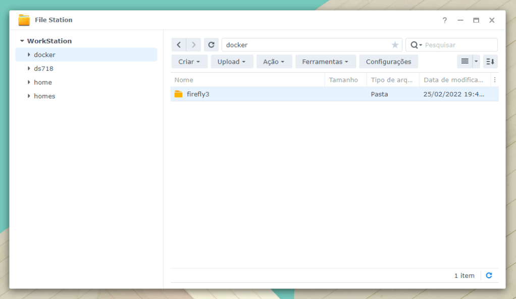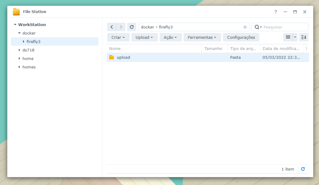 Crie uma pasta dentro da pasta compartilhada “Docker” e nomeie-a de “firefly3” (todo minúsculo mesmo) e em seguida uma pasta dentro de firefly3 com o nome de “upload”: