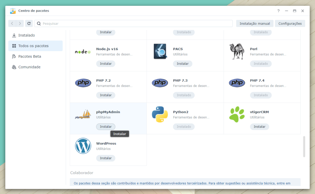 Uma vez concluída a instalação do MariaDB, procure no “Centro de Pacotes” por phpMyAdmin e clique em “Instalar”: