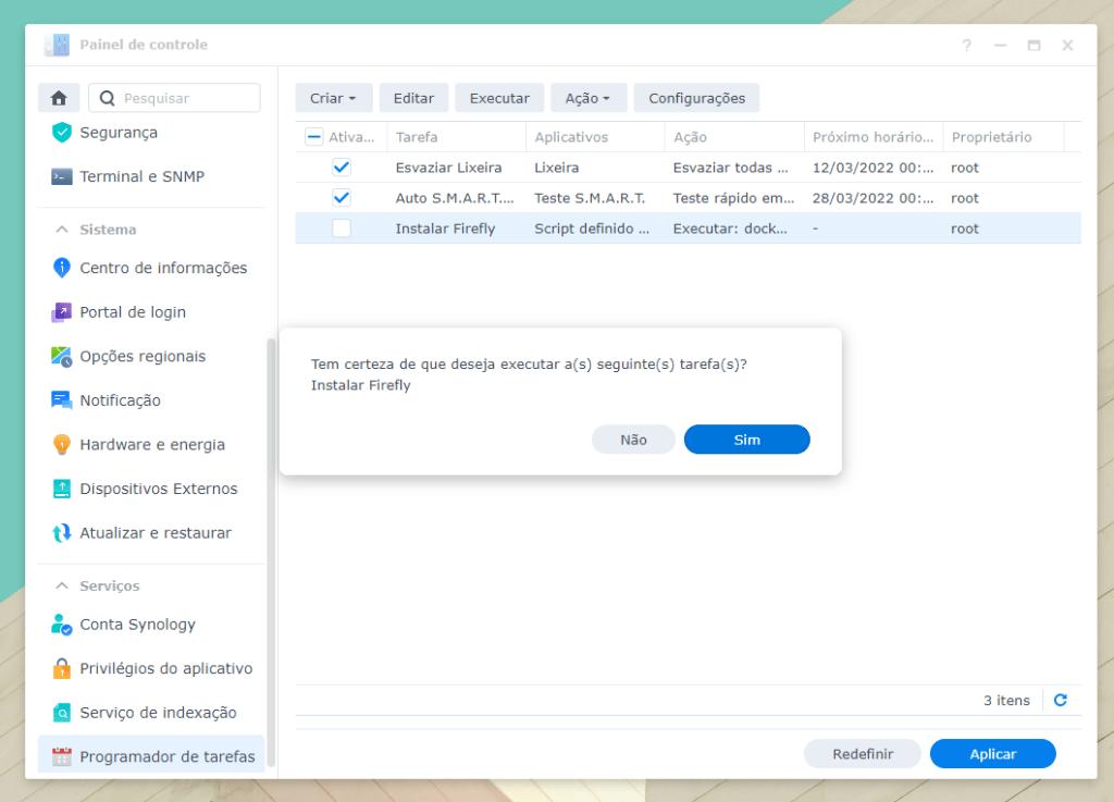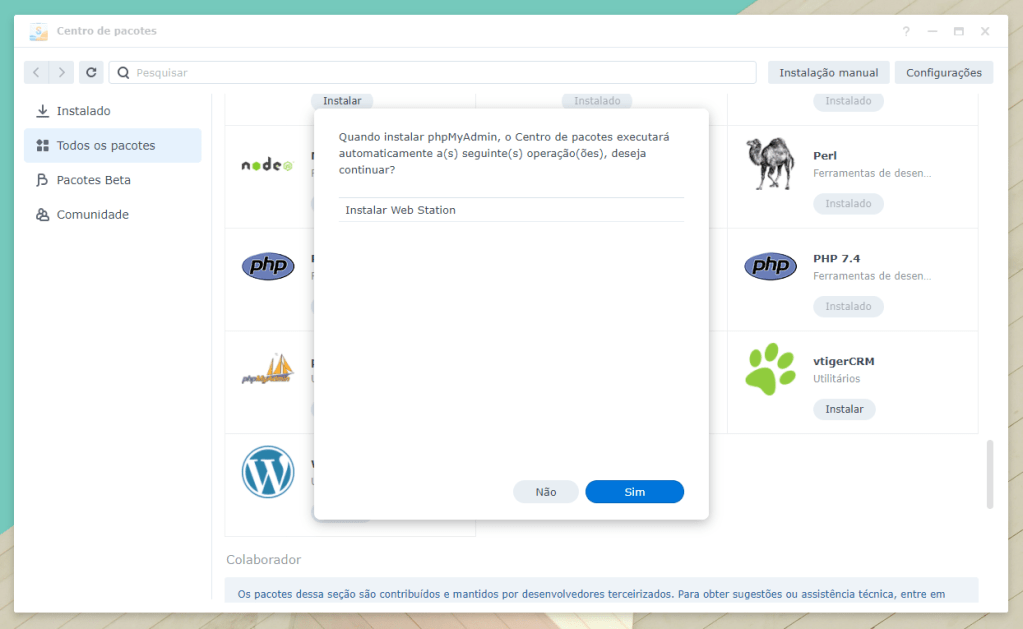 É possível que ao tentar instalar, o sistema o avise que irá precisar instalar outros pacotes (no meu caso o Web Station, mas no seu pode haver outros), mas, independente dos pacotes que ele peça clique em “Sim” e prossiga com a instalação de todos.