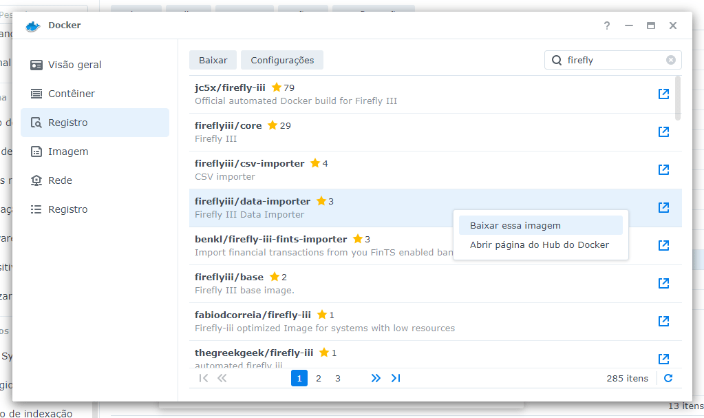 Abra o Docker e clique em “Registro”. Procure por “firefly”, selecione a imagem “fireflyiii/data-importer” e clique para baixá-la.
