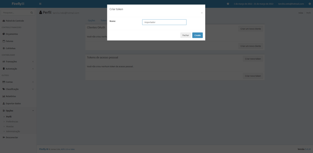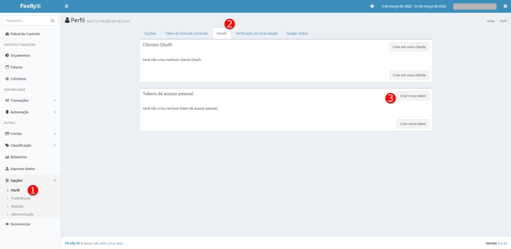 Dentro do Firefly, vá para a sua página de “Perfil” e selecione a aba “OAuth”. Nela você irá encontrar a seção “Tokens de acesso pessoal”. Clique em “Criar novo token”: