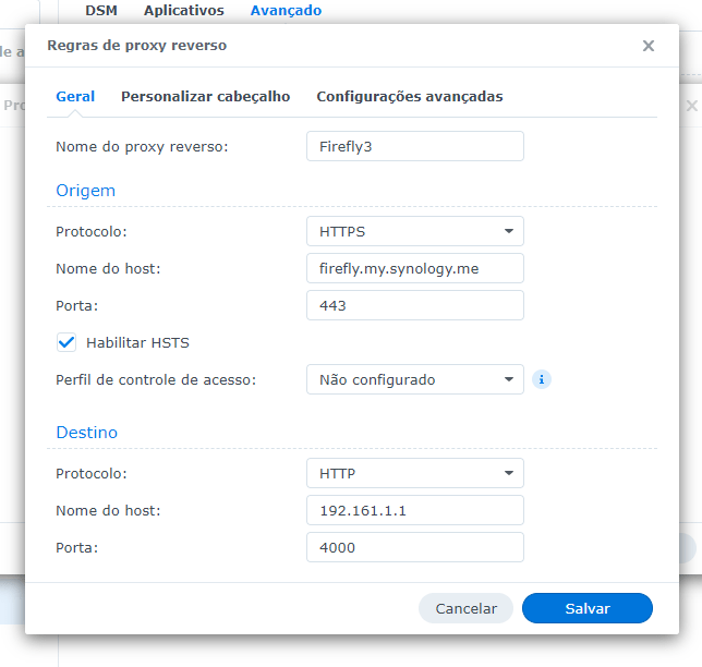 Note que coloquei “firefly” antes do DDNS. Esse vai ser o endereço ao qual você usará para acessar o Firefly. A “Porta” da seção “Origem” com valor 443 deve ser mantido, pois será pelo roteamento dessa porta que você terá acesso ao Firefly pela internet. Fique atento a todos os campos acima. Volto a dizer que os valores são meramente demonstrativos (exceto a porta 443) para que facilite o input com os valores reais do seu sistema. As outras abas não são necessárias alterar, mas pode fazê-lo ao seu critério. Agora clique em “Salvar” e vamos adiante.