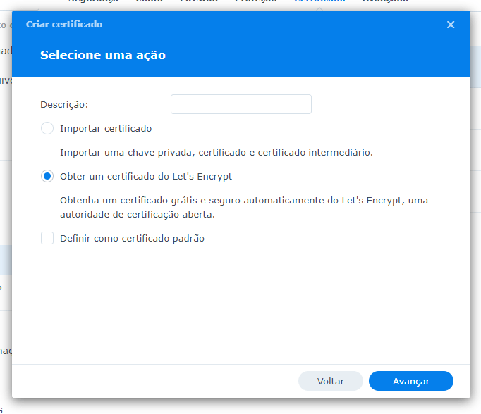 Selecione “Obter um certificado do Let’s Encrypt” e clique em “Avançar”: