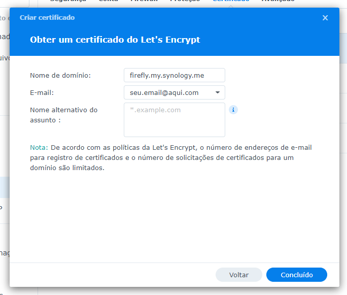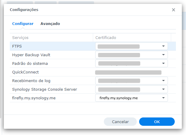 - Certificado recém criado para o Firefly (como exemplo: firefly.my.synology.me)