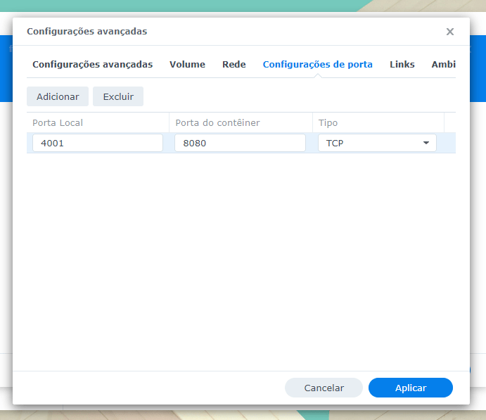 Em seguida clique em “configurações avançadas” e navegue para a aba “Configuração de portas” e troque o “Auto” por uma porta livre no seu sistema (exemplo: 4001):