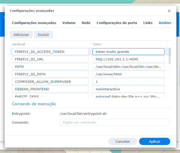 - FIREFLY_III_URL -> seria o IP + porta do contêiner (dando continuidade ao nosso exemplo http://192.161.1.1:4000).