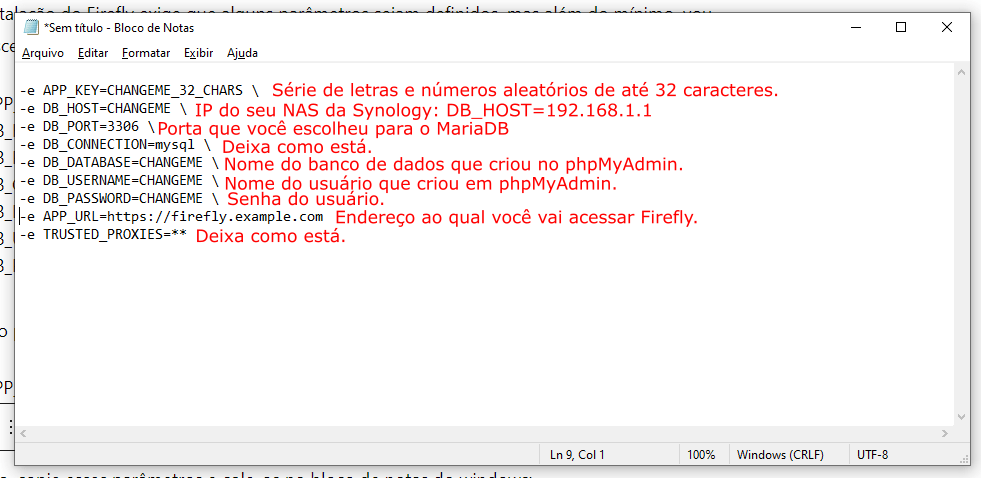 Agora, copie esses parâmetros e cole-os no bloco de notas do windows. Depois modifique os valores conforme as instruções: