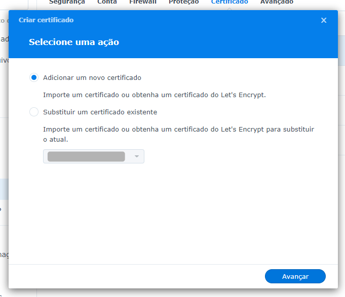 Depois selecione “Adicionar um novo certificado” e clique em “Avançar”: