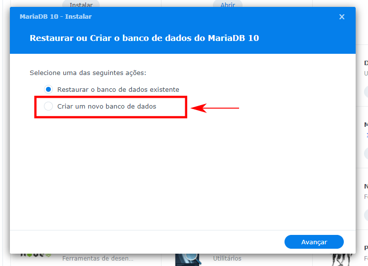 Depois é só seguir o processo de instalação, selecionando o “Criar um novo banco de dados”: