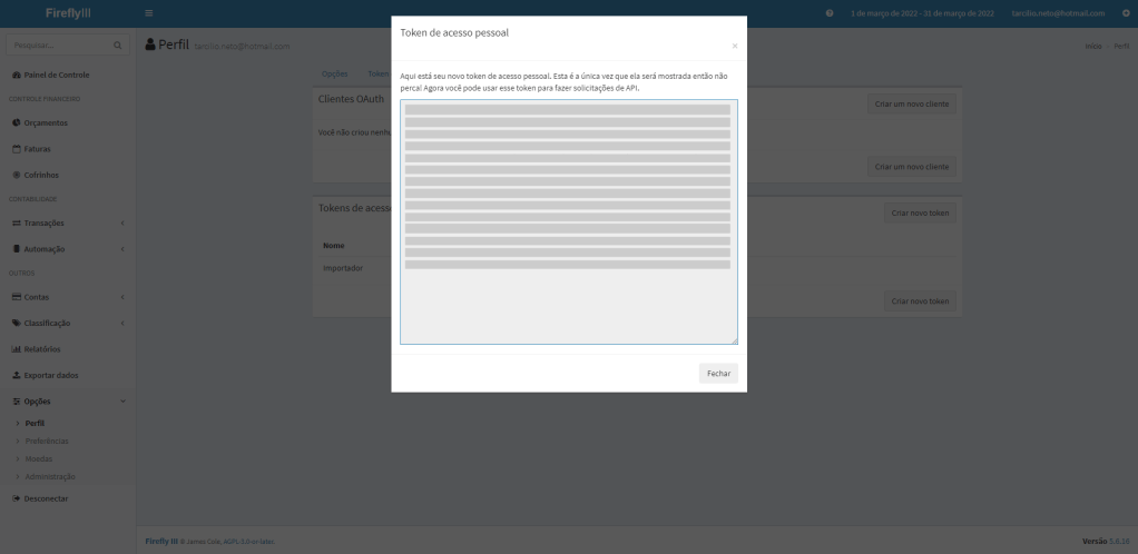 - FIREFLY_III_ACCESS_TOKEN -> obtido no seu Perfil do Firefly.