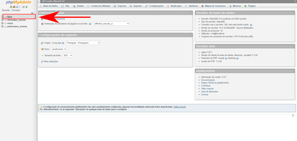Uma vez concluída, clique em “Abrir” o phpMyAdmin, e em seguida faça o login com os dados usados ao instalar o MariaDB (Passo 1). Ao entrar no aplicativo, irá aparecer a seguinte página, clique em “Novo” para adicionar um novo banco de dados:
