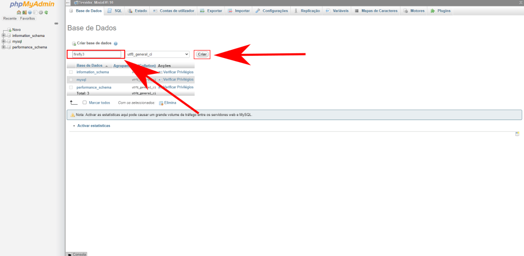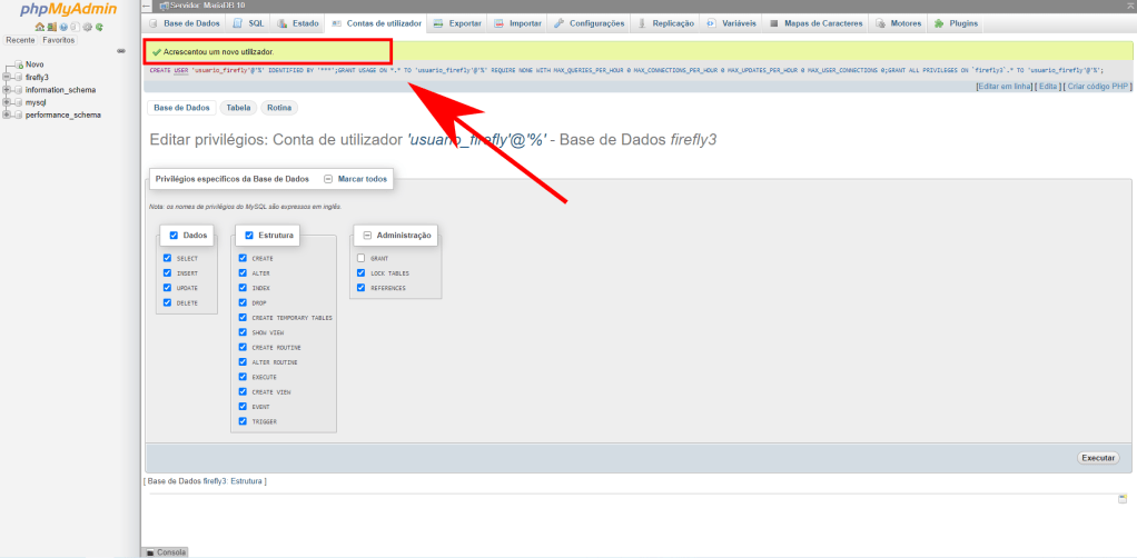 Pronto, com o banco de dados configurado podemos agora prosseguir com o Firefly.
