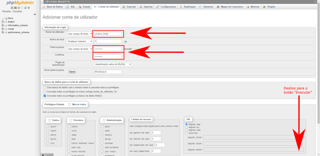 Crie o usuário escolhendo um nome, gerando uma senha e depois clicando em “Executar” no final da página: