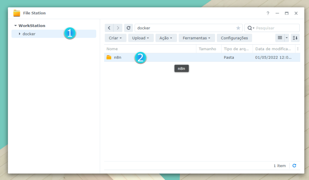 Crie uma pasta dentro da pasta compartilhada “Docker” e nomeie-a de “n8n”: