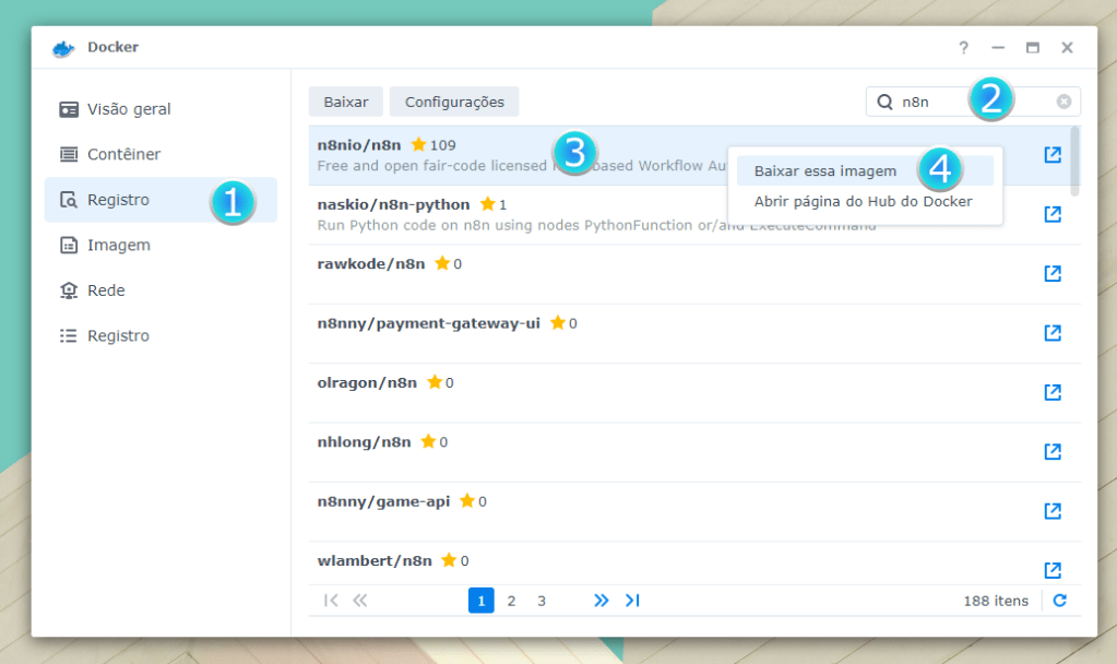 Abra o Docker e clique em “Registro”. Procure por “n8n”, selecione a imagem “n8nio/n8n” e clique para baixá-la.