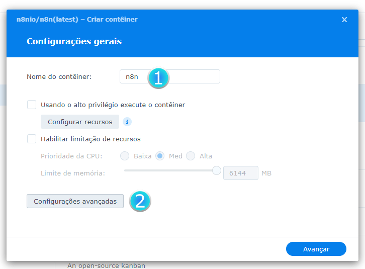 Em seguida defina um nome para o contêiner e clique em “Configurações avançadas“: