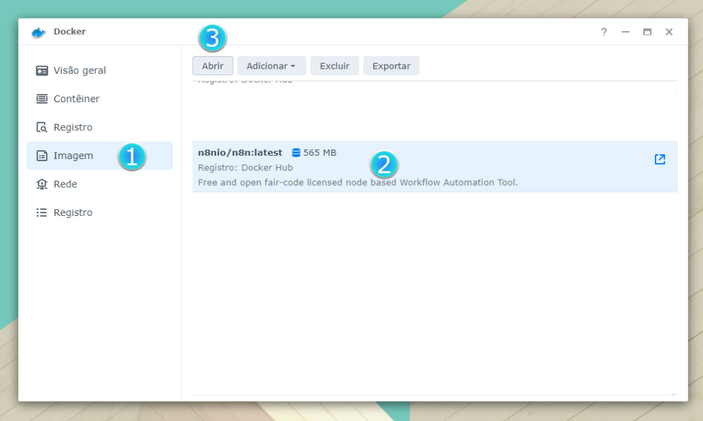 No Docker, vá em “Imagem”, selecione a imagem do n8n e clique em “Abrir”: