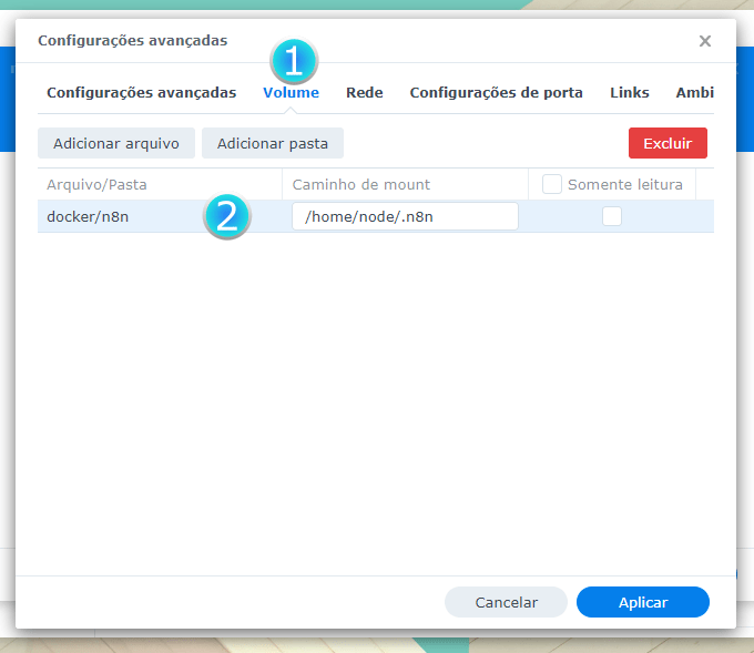 Na aba “Volume” mapeie a pasta que havia criado anteriormente: