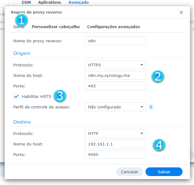 Note que coloquei “n8n” antes do DDNS. Esse vai ser o endereço ao qual você usará para acessar o cofre. A “Porta” da seção “Origem” com valor 443 deve ser mantido, pois será pelo roteamento dessa porta que você terá acesso ao n8n pela internet. Fique atento a todos os campos acima. Volto a dizer que os valores são meramente demonstrativos (exceto a porta 443) para que facilite o input com os valores reais do seu sistema. As outras abas não são necessárias alterar, mas pode fazê-lo ao seu critério. Agora clique em “Salvar” e vamos adiante.
