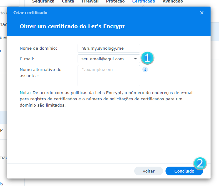 - Certificado recém criado para o n8n (como exemplo: n8n.my.synology.me)